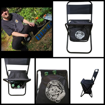 Klappstuhl mit Kühltasche. Damit ihr am Spot auch gemütlich sitzen könnt mit kühlem Getränk.